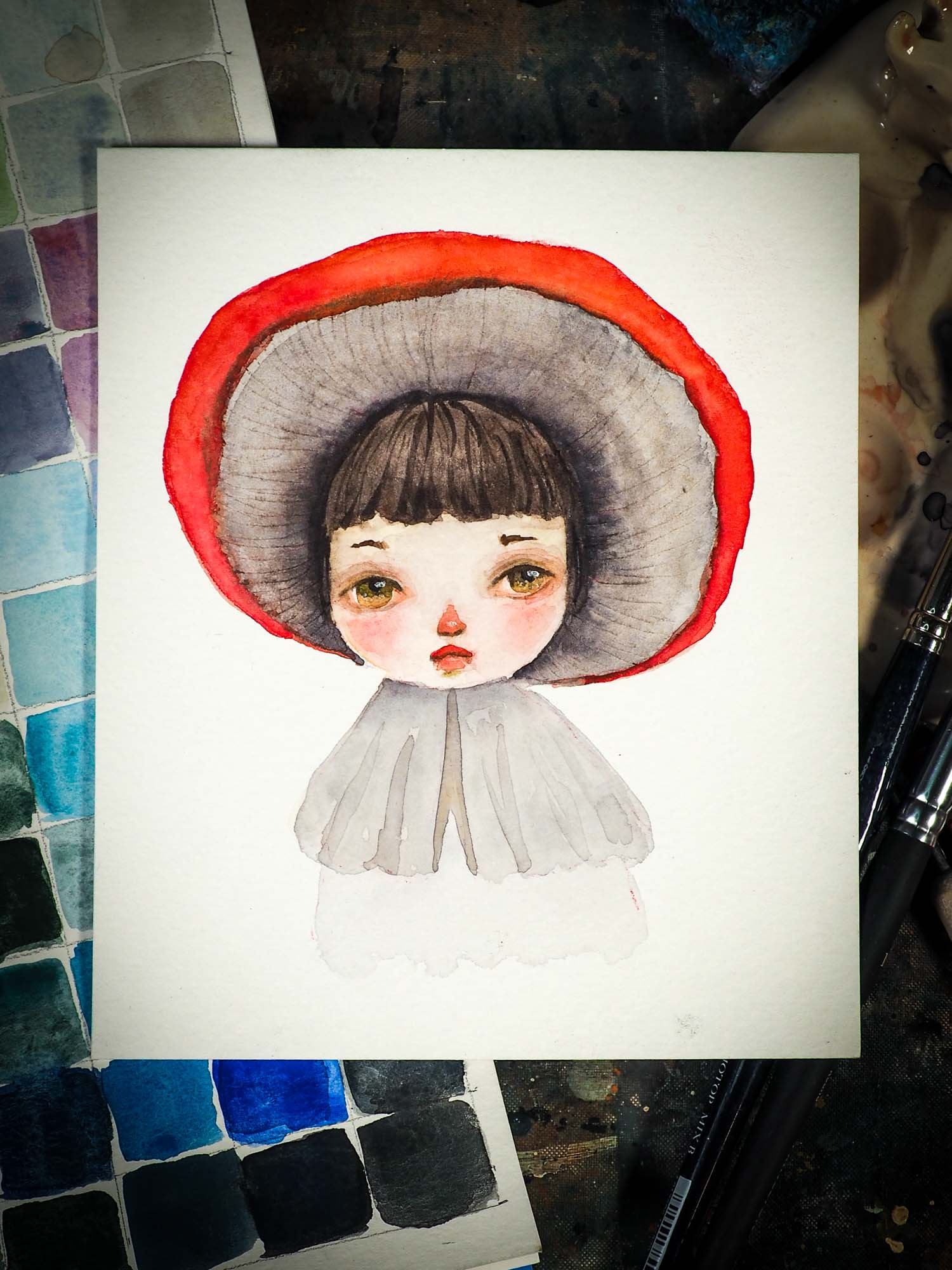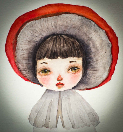 This series of original watercolors portraits by me, Idania Salcido, the artist behind Danita Art, depicts a group of faeries, or maybe girls, playing as mushrooms, with their caps as hats, my signature beautiful and expressive eyes, and capes as their clothes.
