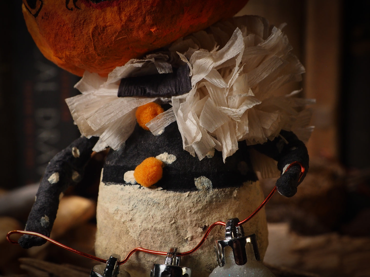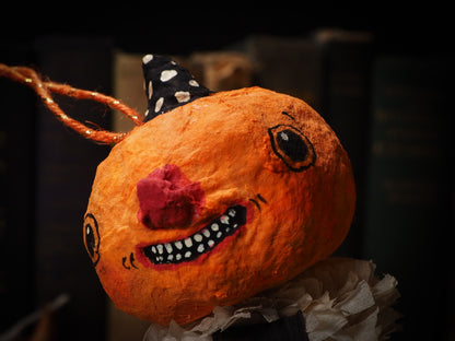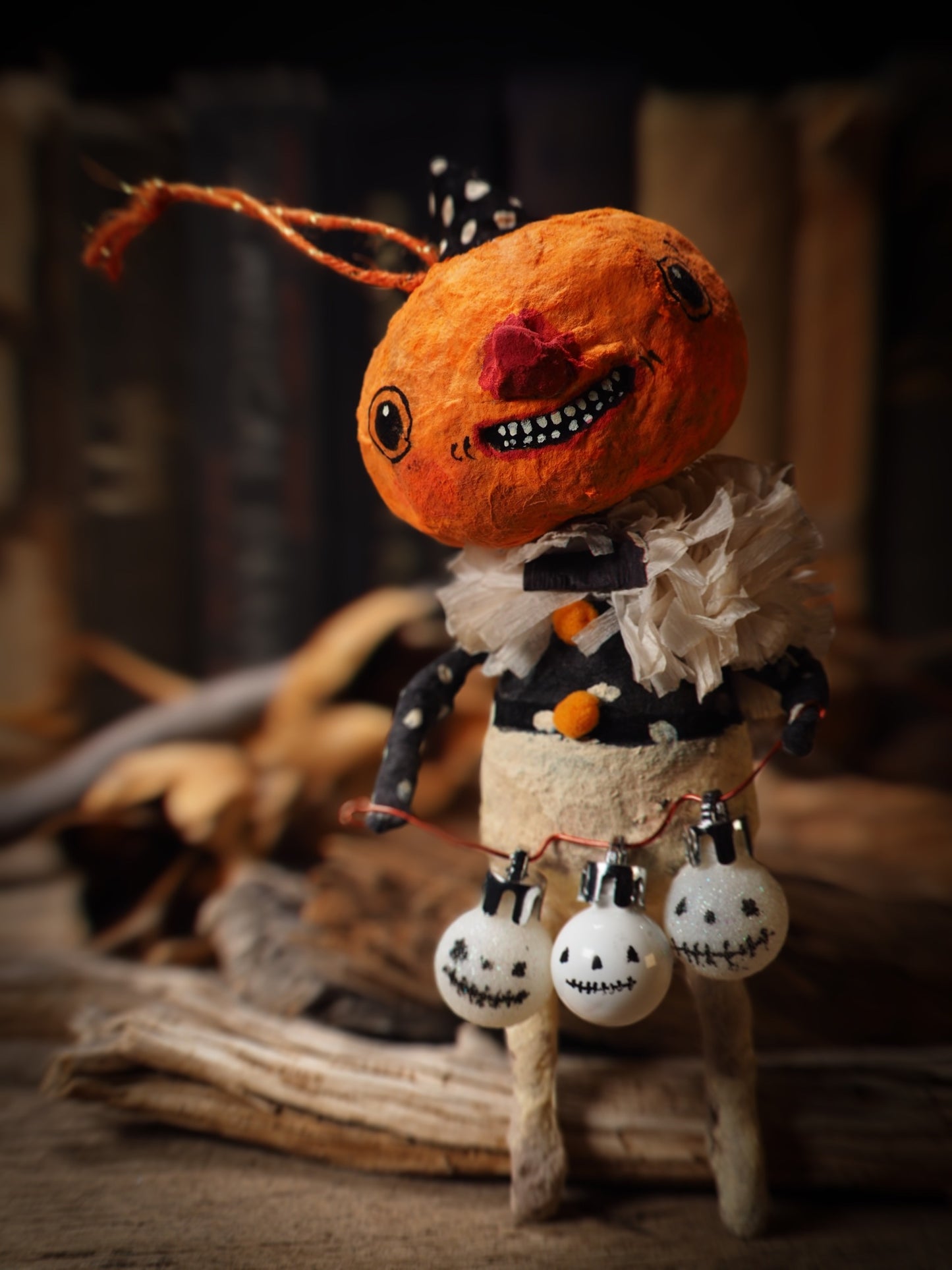The Halloween art doll has a jack-o-lantern on it's hand and it can be displayed sitting on a shelf, or hanging as an ornament from your Halloween or Christmas tree.