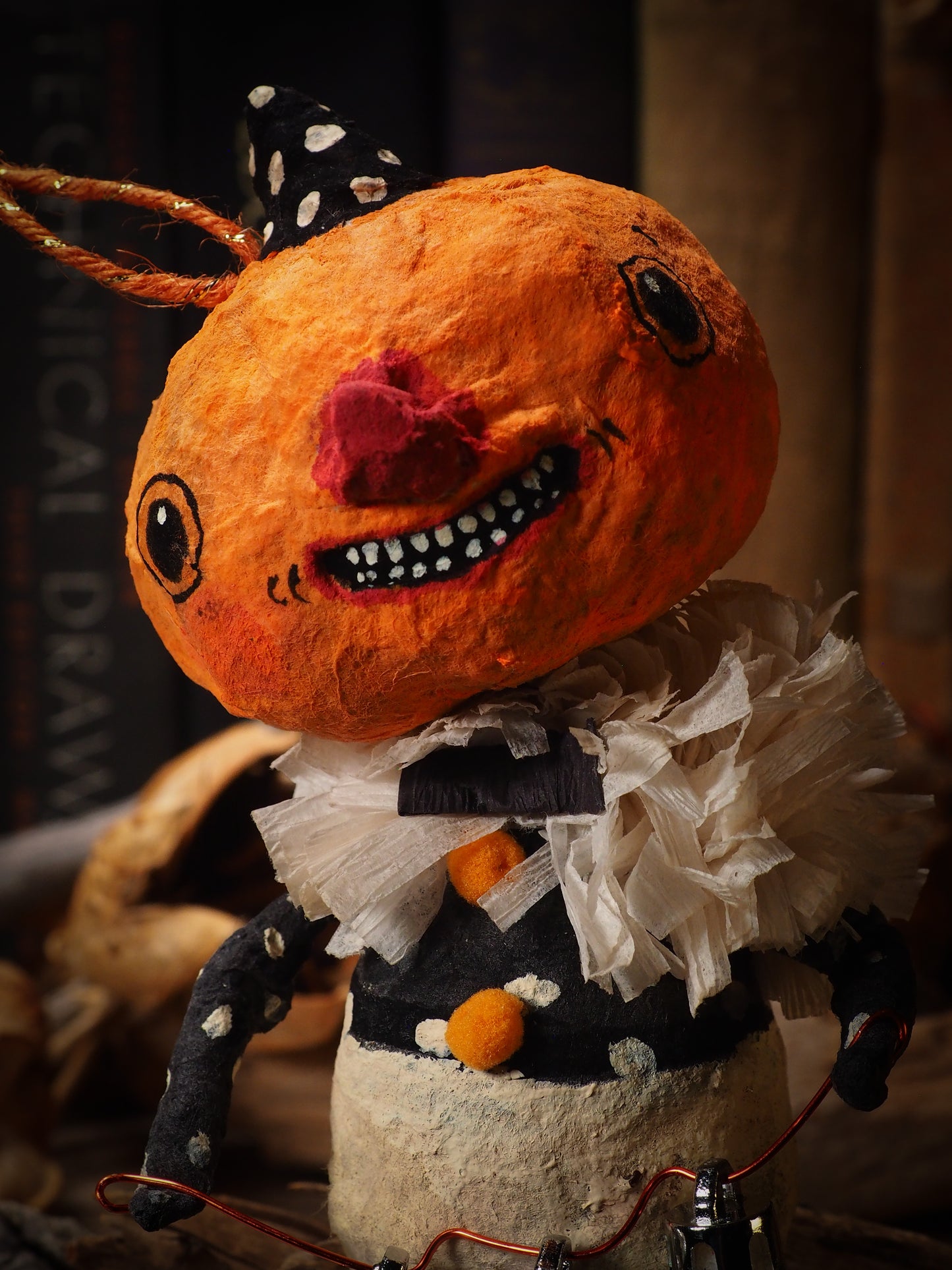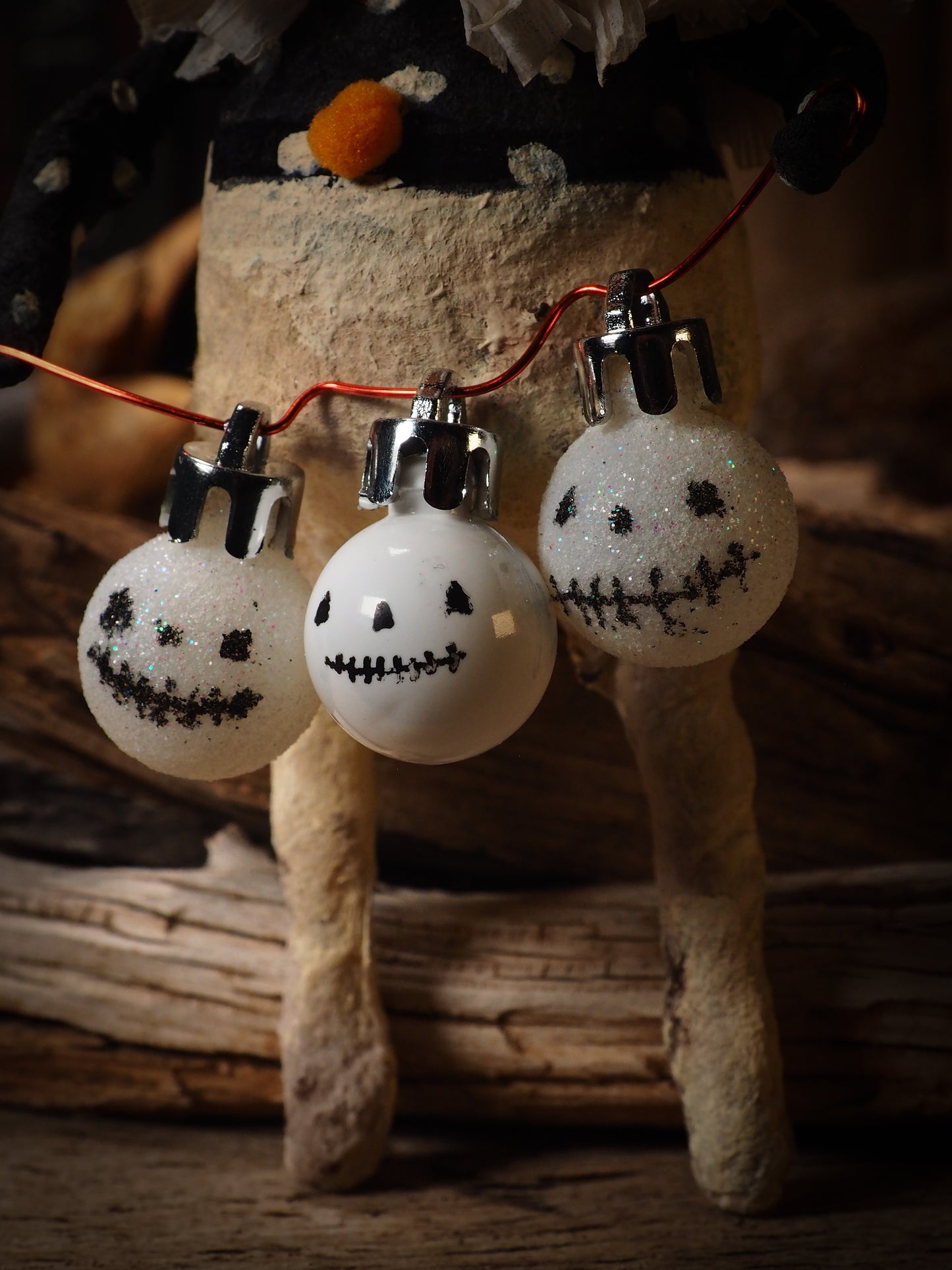 This handmade future Halloween ghost original art doll was made by Danita using spun cotton and paper clay, sculpting a whimsical face with the famous Danita lively eyes, painted with a spark of life on them.