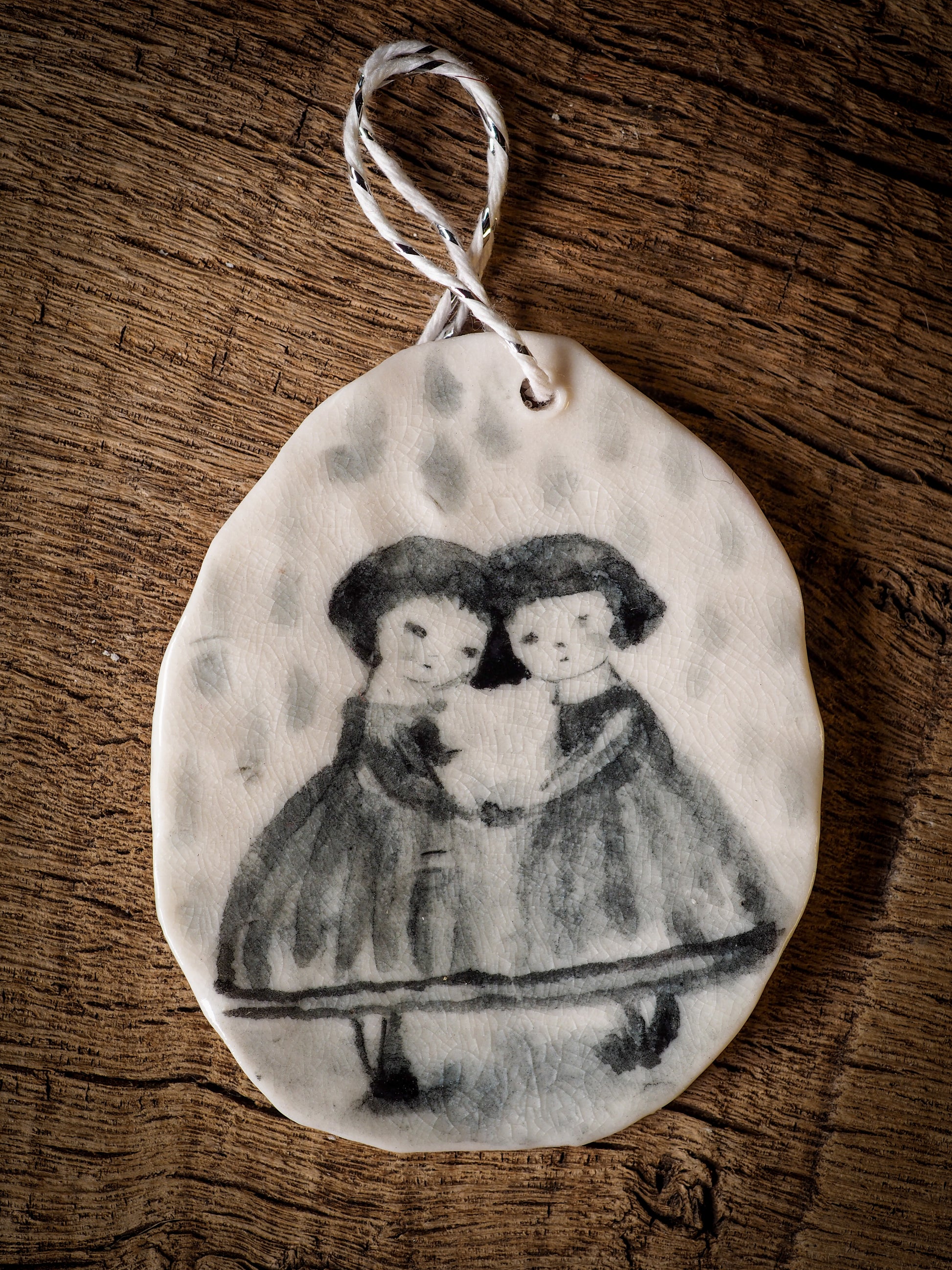 Totally hand made on my studio, each of my ornaments is hand painted, fired twice on a kiln at more than 2000 Degrees, then finished with a beautiful twine hanger.