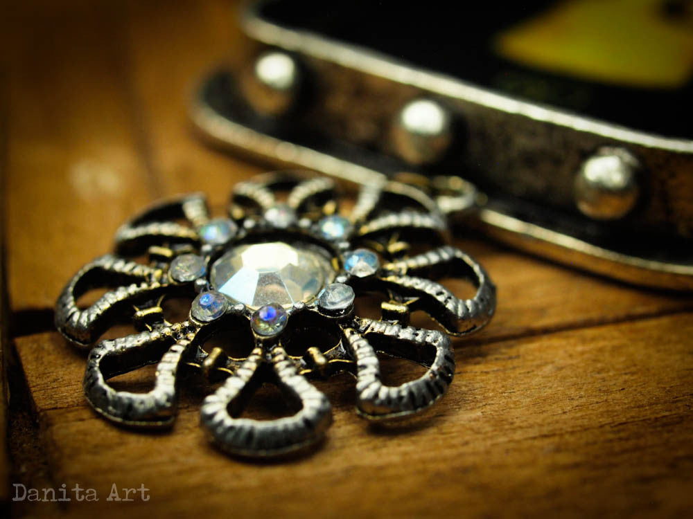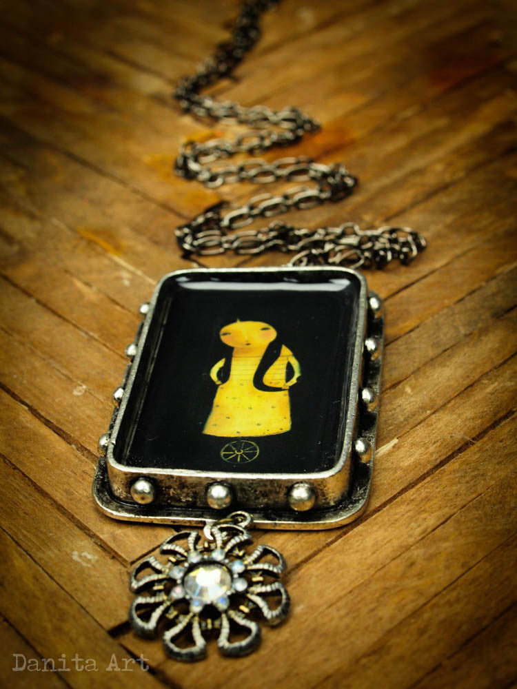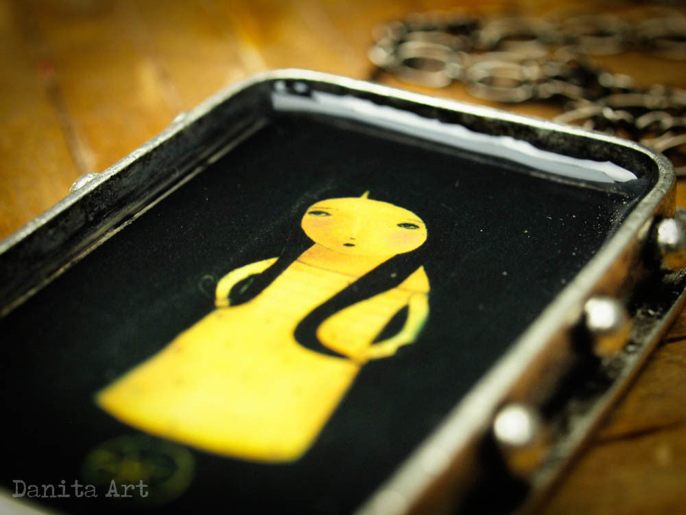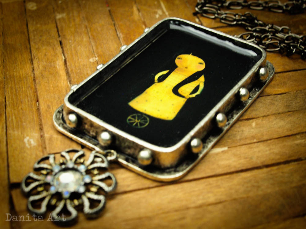 The large oxidized metal setting measures 1.5x2.5 inches, with a deep tray where the image is set underneath a layer of transparent resin that gives a beautiful depth to the piece.
