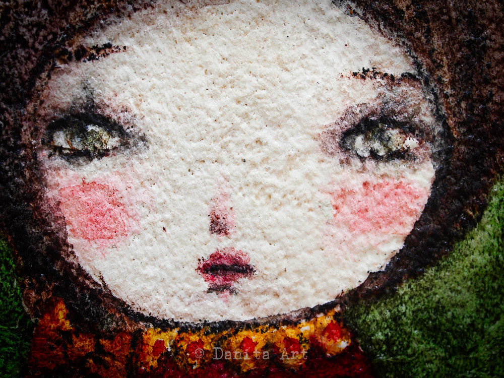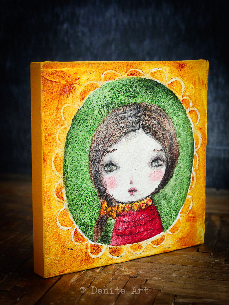 This time I mixed watercolors on wood with a very rough surface and created a series of mini girl portraits.