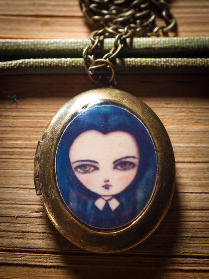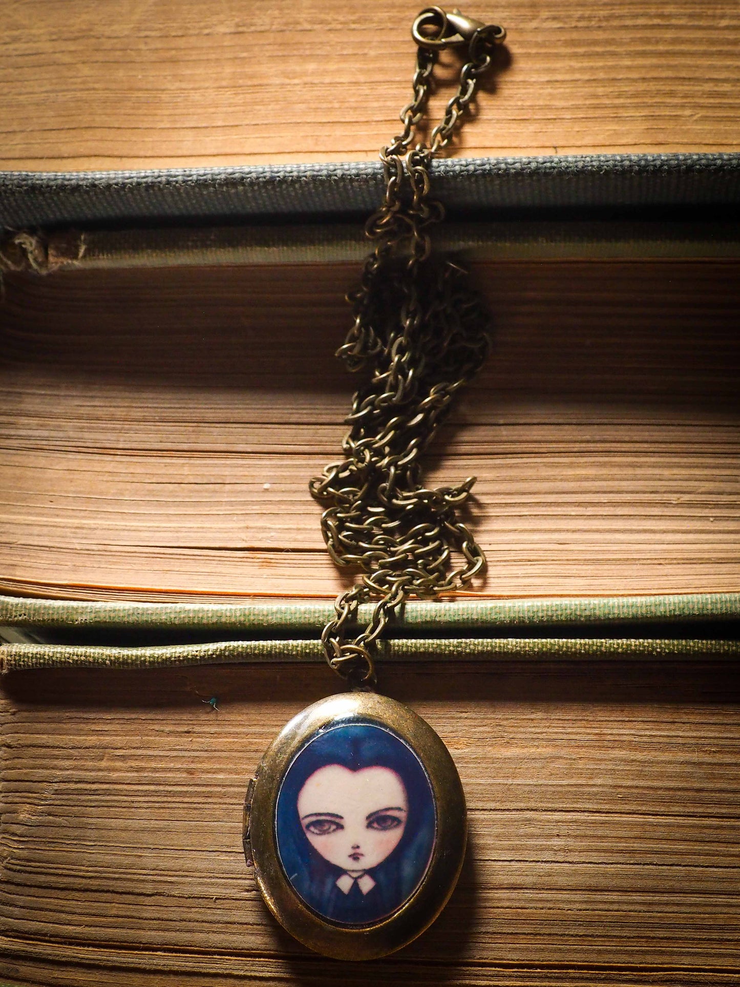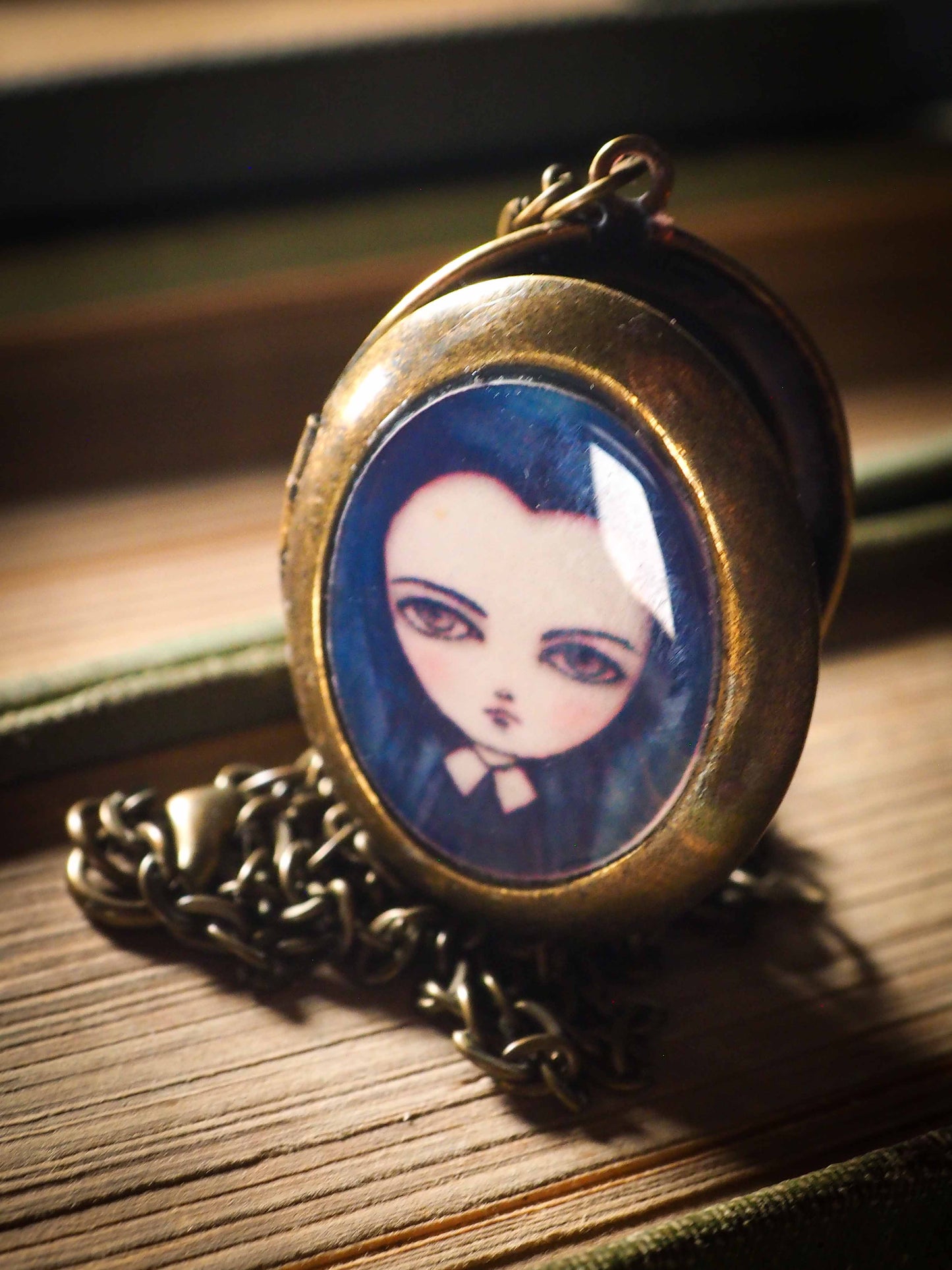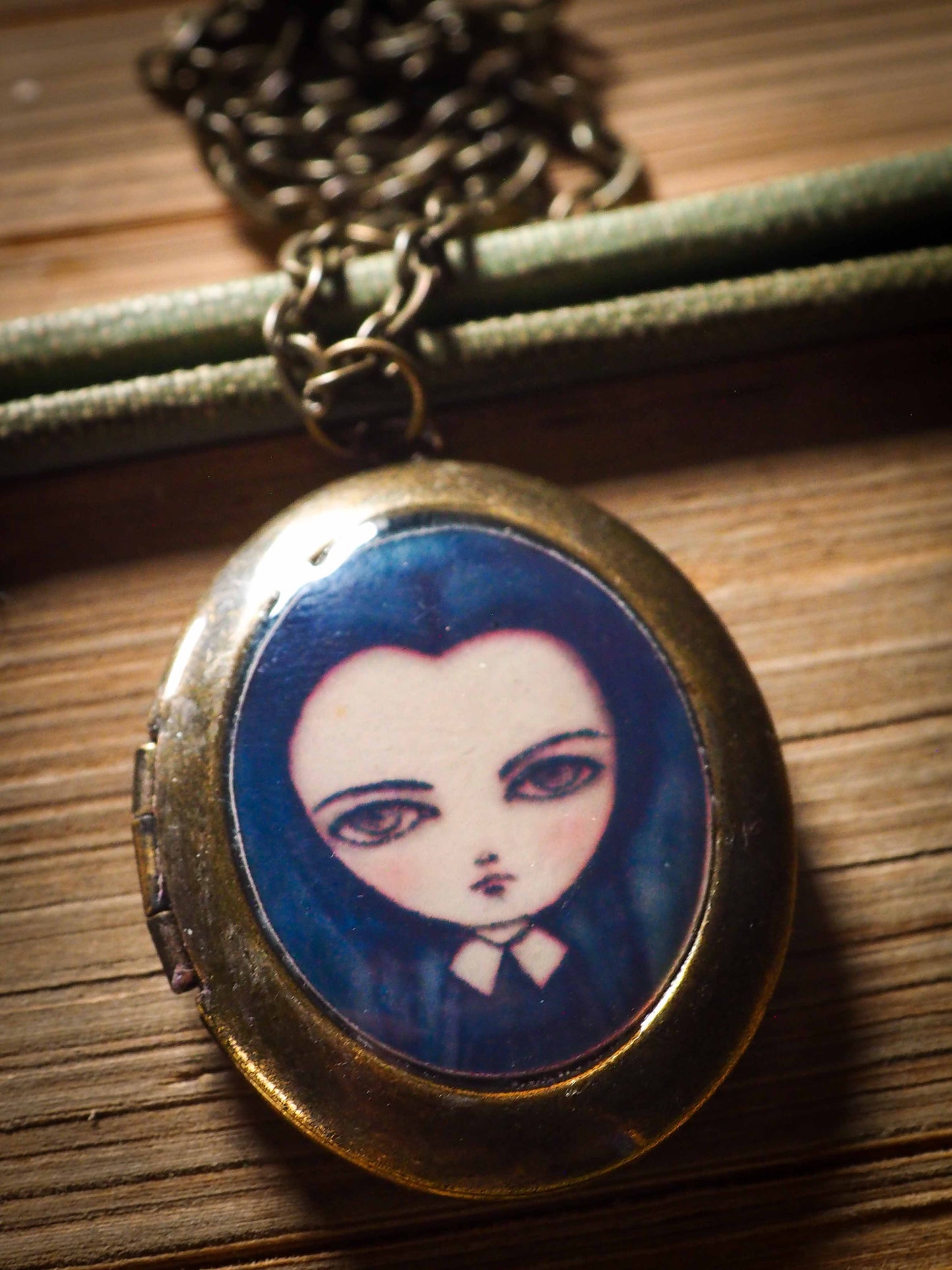 This is an original, handmade locket necklace by Idania Salcido, the artist behind Danita Art. It has a reproduction of an original halloween illustration by Danita, covered in resin, and can be opened to add a lock of hair, a picture or the favorite memento of your very special person.