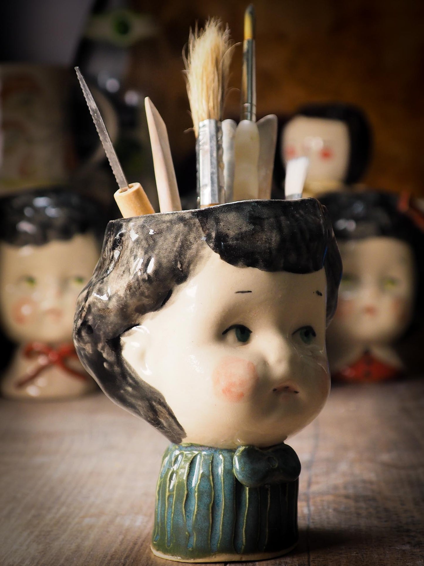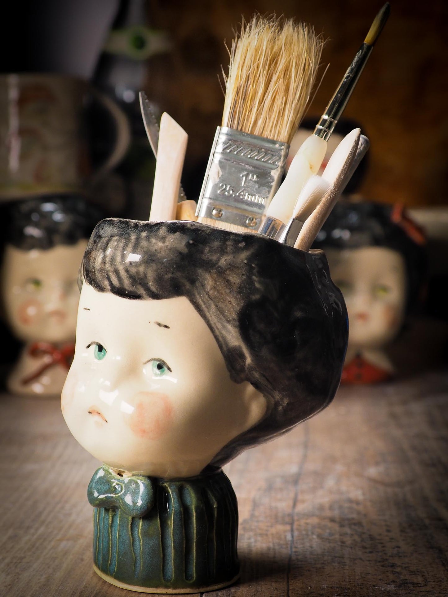They are made of glazed ceramic to hold your favorite brushes, for any medium. I prefer watercolors, but they can also hold brushes for acrylics, inks and oil paints, and can be easily cleaned with water or mineral spirits.