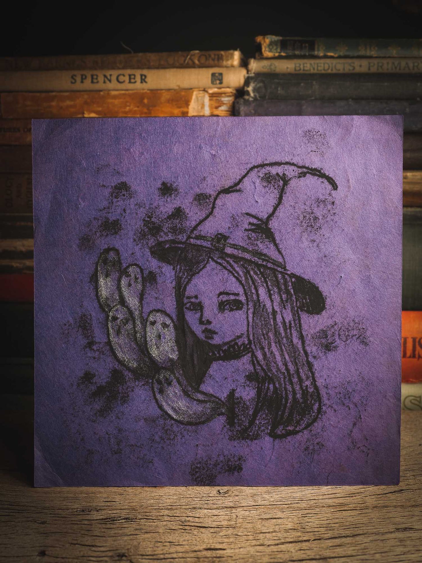What better way to celebrate Halloween than with Witches? I loved this inked monoprint! She is traveling with her ghosts, ready for an amazing night of trick-or-treat.