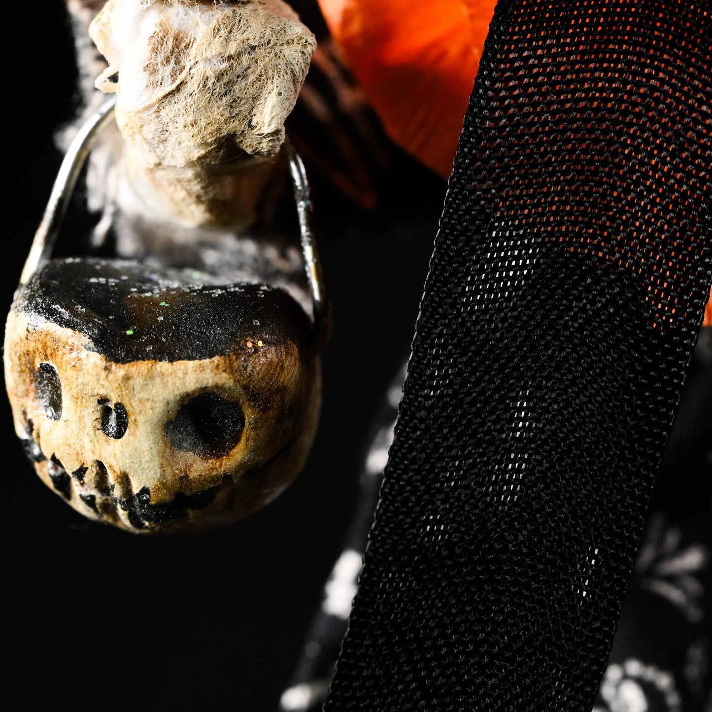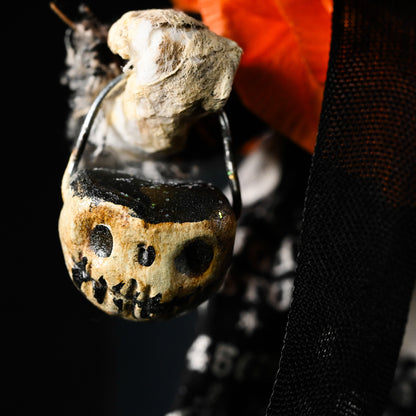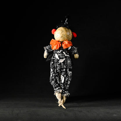 The Halloween art doll has a jack-o-lantern on its hand and it can be displayed sitting on a shelf, or hanging as an ornament from your Halloween or Christmas tree.