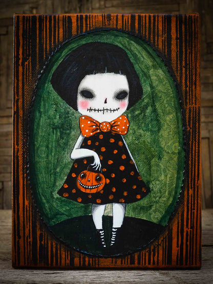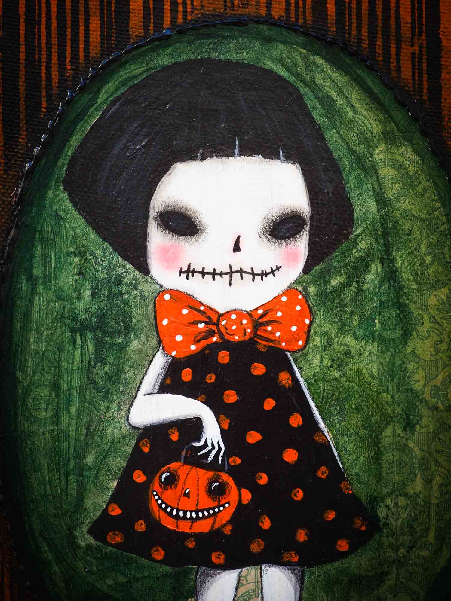 This whimsical zombie girl is an original Halloween painting by Danita Art. She is getting ready to go out trick-or-treat with her friends the wolves, the vampires, the witches, the ghouls and the ghosts.