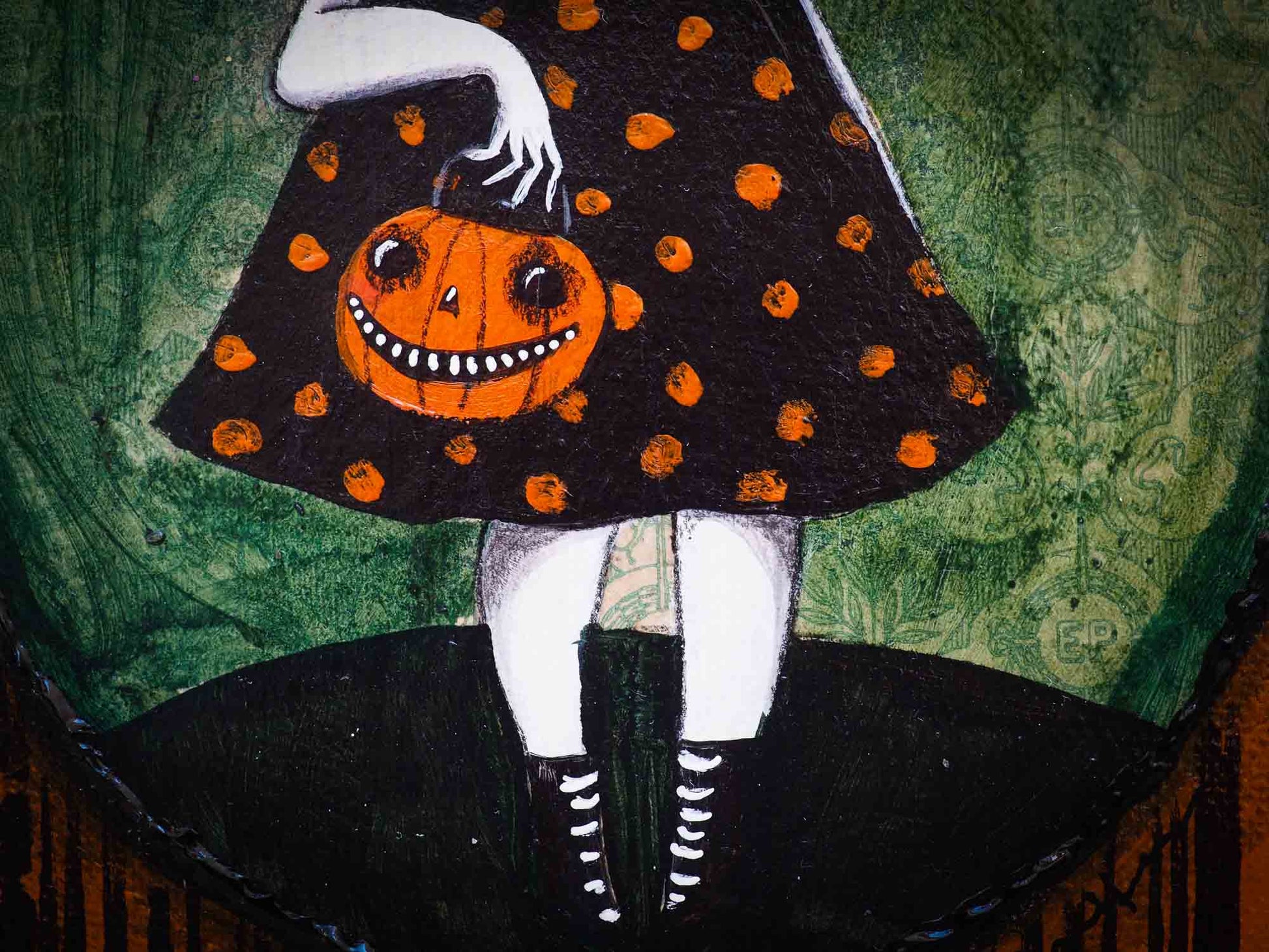 Wearing a polka dot dress in black and orange, she also has a smiling jack-o-lantern to keep all her Halloween candy very safe.